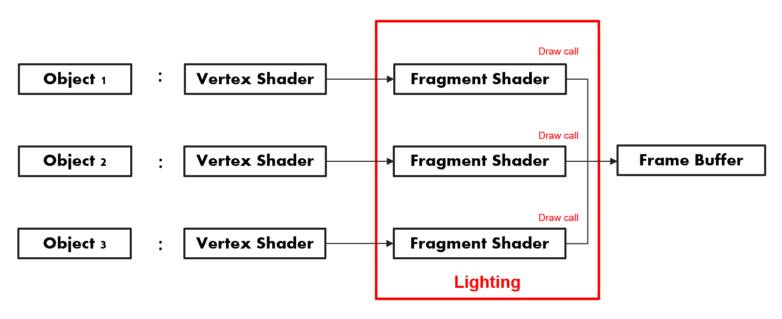 Forward Rendering은 오브젝트들을 바로 하나의 버퍼에 그려주기 때문에 각 오브젝트를 그려줄 때 마다 조명 연산을 수행합니다. 광원이 많을수록 드로우 콜의 호출 횟수가 늘어나면서 성능에 큰 부담을 안겨줄 수 있습니다.
