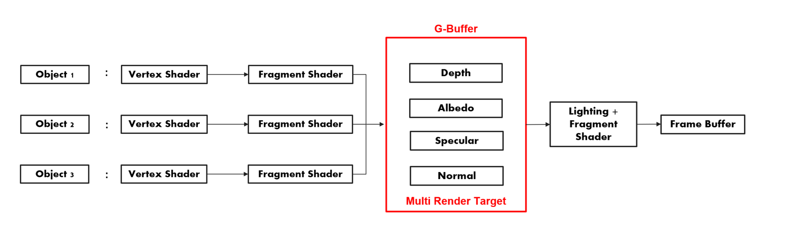 Deferred Rending의 연산처럼 각 오브젝트의 Normal 정보와 Depth 정보 Diffuse 정보 등을 모아서 한번에 처리해주는 것을 볼 수 있습니다. MRT(Multi Render Target) 라는 기법으로 각 Render Target에 각각의 정보들을 그려준 뒤 G-Buffer 에 저장하고 하나의 Texture에 연산하여 그려줍니다.