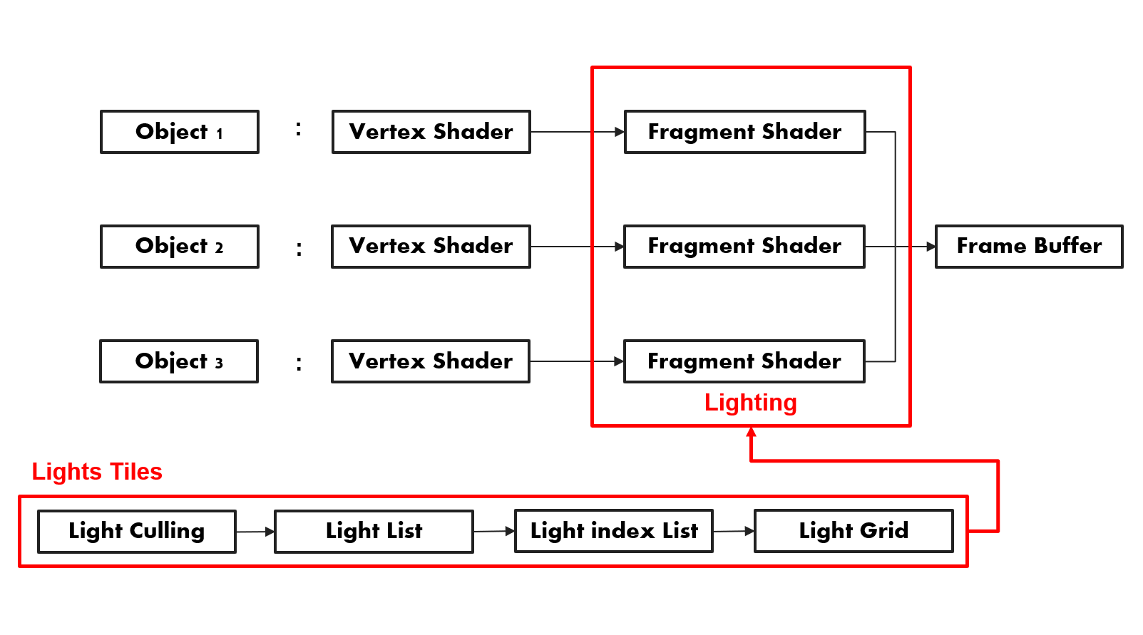 두 번째 표준 Forward Rendering pass 를 사용해 Scene 의 개체를 셰이딩 처리하지만, 씬의 모든 동적 조명을 반복해 계산하는 대신 현재 Pixel의 화면 공간 위치를 사용하여 이전패스에서 계산된 그리드의 조명 목록을 조회한다. 이 Light Culling 은 Pixel을 올바르게 조명하기 위해 반복해야 하는 중복 조명의 수를 크게 줄이므로 표준 Forward Rendering 기술에 비해 상당한 성능 향상을 제공하게 된다. Forward + 는 표준 기술을 통합하기 때문에 기존방식으로 구축된 그래픽 엔진에 통합 될 수 있다. Forward + 는 G-Buffer 를 사용하지 않으며 Deferred 의 한계를 겪지 않는다. 불투명 및 투명 지오메트리 모두 Forward +를 사용하여 렌더링할 수 있다. 최신 그래픽 하드웨어를 사용하여 5,000~6,000개의 동적 조명으로 구성된 장면을 Full HD 해상도에서 실시간으로 Rendering 할 수 있게된다.